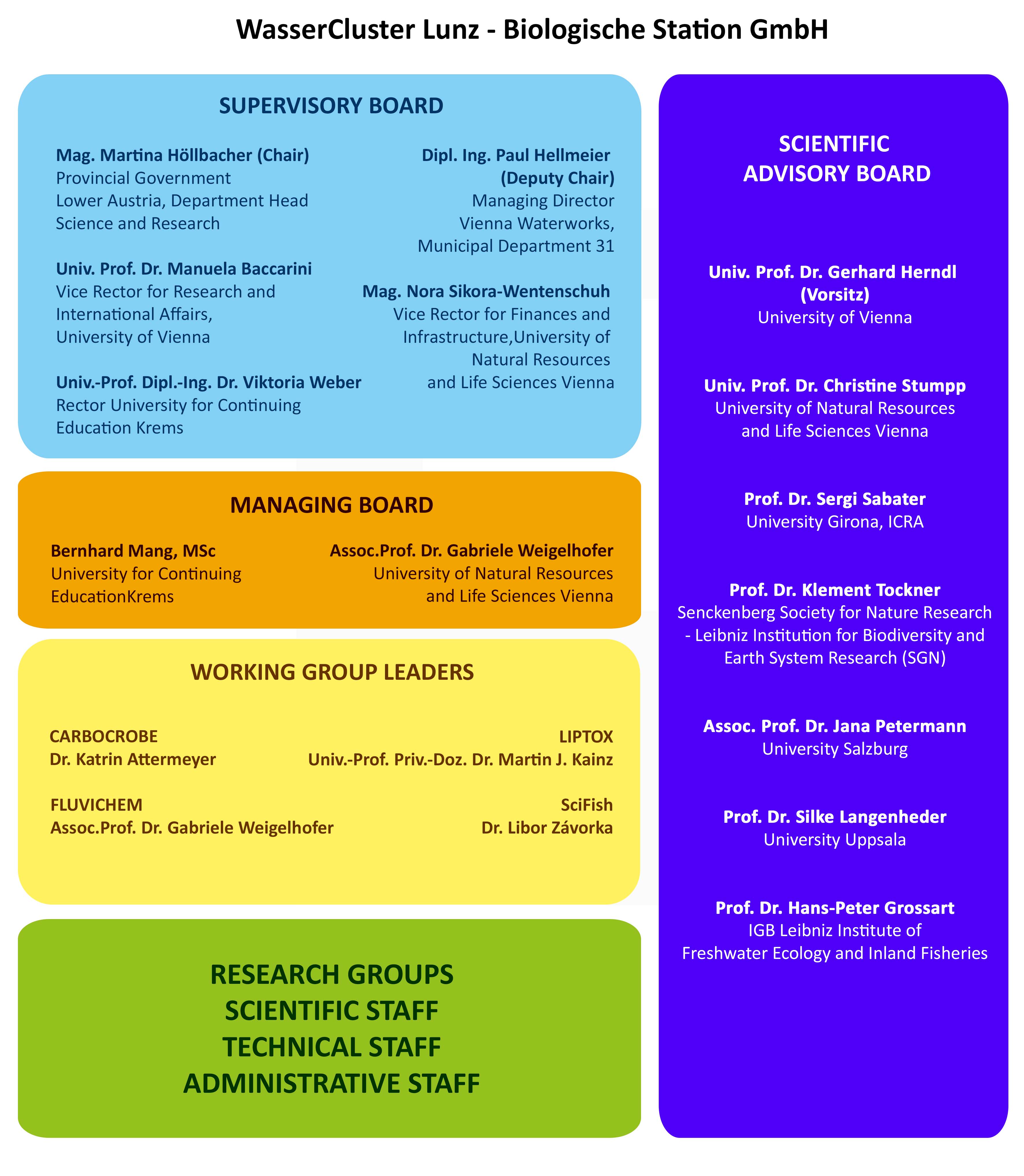 The supervisory board consists of 3 representatives from our academic stakeholders University of natural resources and life sciences, BOKU Vienna, University for Continuing Education Krems and the University of Vienna as well as of two representatives from our principal funding authorities (Provincial Government of Lower Austria, Municipal Authority of Vienna). At the University of Natural Resources and Life Sciences Vienna, WasserCluster is linked to the Department of Water - Atmosphere - Environment, at the University for Continuing Education Krems it is linked to the Department for Health and Medicine - Research Lab Aquatic Ecosystem Research and -Health, and at the University of Vienna it is linked to the Department of Functional and Evolutionary Ecology.
